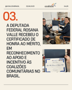 Como forma de reconhecimento, a Deputada Rosana Valle recebeu o Certificado de Honra ao Mérito, entregue pela Associação Pró-Coalizões do Brasil, em agradecimento ao apoio e incentivo às iniciativas de fortalecimento comunitário no Brasil.