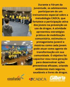 Um dos momentos mais marcantes do encontro foi o treinamento de adolescentes na metodologia CADCA, que destacou a importância da mobilização comunitária e da voz jovem no processo de transformação social. A atividade capacitou os participantes a atuarem como multiplicadores em seus territórios, criando ações preventivas eficazes e sustentáveis.