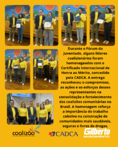 Durante o Fórum, alguns líderes coalizionários receberam o Certificado Internacional de Honra ao Mérito, entregue pela CADCA em reconhecimento às suas ações e esforços no fortalecimento das coalizões comunitárias no Brasil. A homenagem reforçou o valor do trabalho coletivo e da dedicação de quem atua diariamente pela construção de comunidades mais saudáveis e seguras.