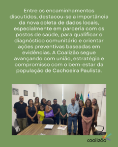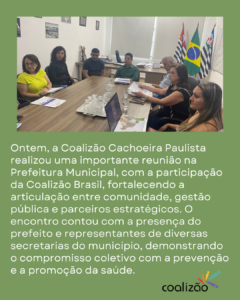 A Coalizão Cachoeira Paulista promoveu, nesta semana, uma reunião estratégica na Prefeitura Municipal, com a participação da Coalizão Brasil, do prefeito e de representantes de diversas secretarias do município. O encontro marcou um importante momento de fortalecimento institucional e alinhamento entre poder público e sociedade civil em prol da prevenção e da promoção da saúde no território.