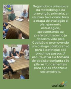A reunião seguiu os fundamentos da metodologia da prevenção primária,especialmente nas etapas de avaliação e planejamento, com a apresentação das ações já desenvolvidas pela Coalizão e a construção coletiva de estratégias futuras. O diálogo com o prefeito permitiu uma análise conjunta da realidade local e a definição de caminhos para ampliar o impacto das ações preventivas no município.